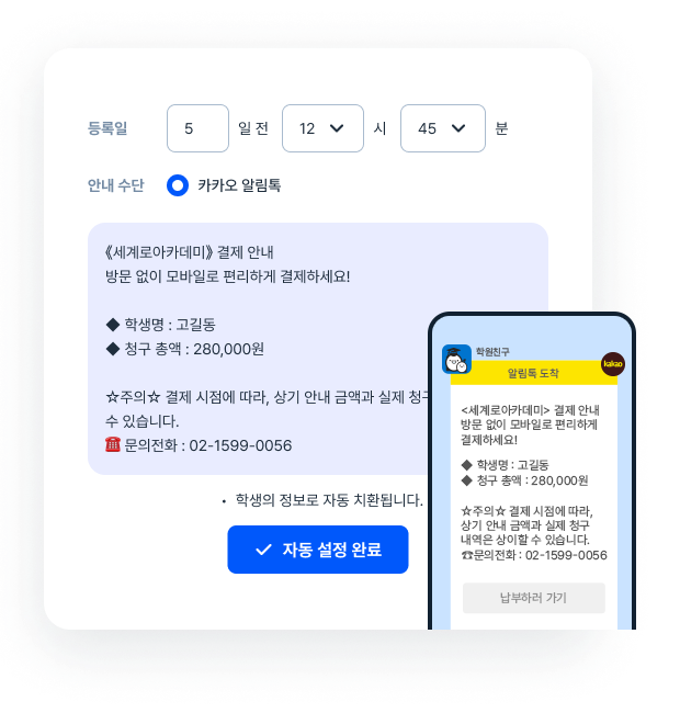 학원의 태블릿이나 휴대폰에 출결 앱을 설치해놓으세요. 학생이 고유번호를 입력해서 등 하원 문자를 발송할 수 있어요.혹시라도 깜빡한 학생들이나 결석한 학생들은 선생님의 더블 체크로 상담이나 보강을 등록할 수 있어요.