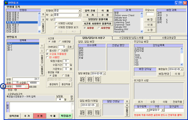 ② 휴일 차감 수강료 자동 발생 기능을 적용할 반을 선택하여 1회당 금액란에 회당 금액을 입력한 후 수정 버튼을