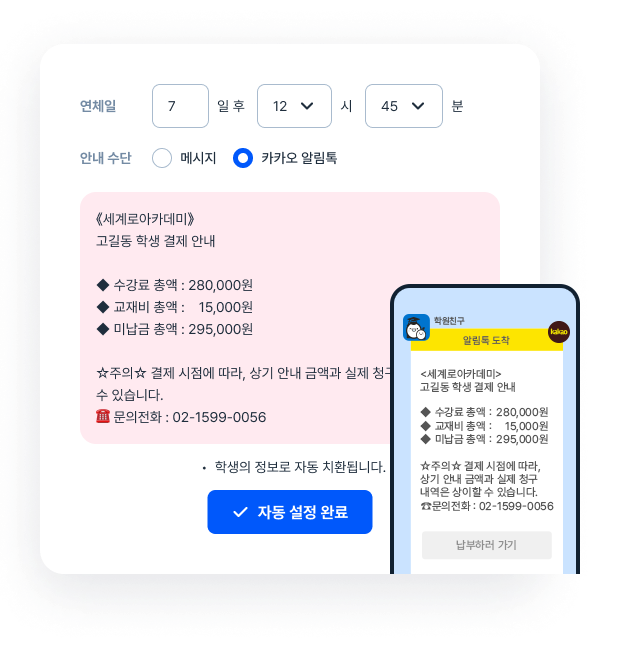 학원의 태블릿이나 휴대폰에 출결 앱을 설치해놓으세요. 학생이 고유번호를 입력해서 등 하원 문자를 발송할 수 있어요.혹시라도 깜빡한 학생들이나 결석한 학생들은 선생님의 더블 체크로 상담이나 보강을 등록할 수 있어요.